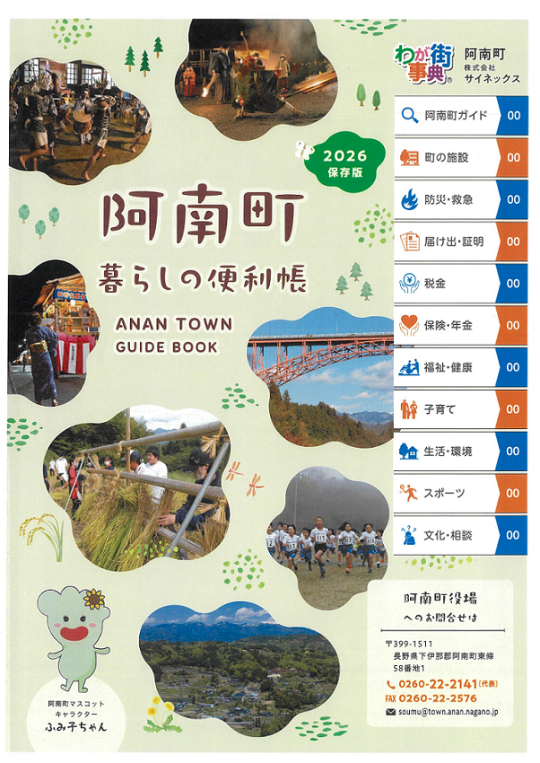町では、役場での各種手続きまどに関する行政情報や医療に関する地域情報など、町民の皆さまの暮らしに役立つ情報を掲載した「阿南町くらしの便利帳」を令和8年3月に発行予定です。